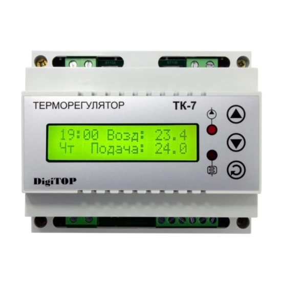 Терморегулятор (Регулятор температуры) ТК-7 предназначен для контроля и поддержания температуры в жилых и производственных помещениях путем управления электрическими системами отопления (с использованием ТЭНовых, электродных котлов и пр.) с контролем температуры ПОДАЧИ, ОБРАТКИ теплоносителя, ТЕМПЕРАТУРЫ ВОЗДУХА в отапливаемом помещении и возможностью управления режимом работы насоса в отопительной системе.