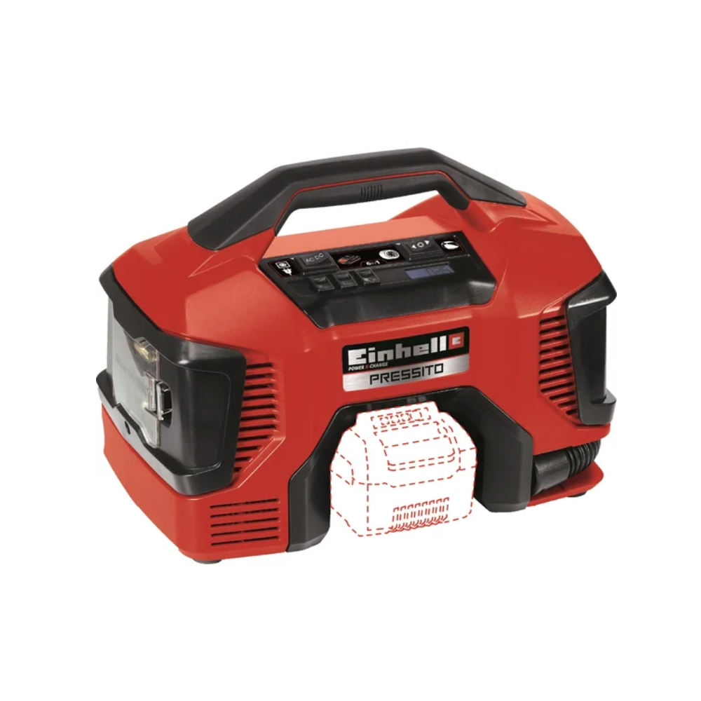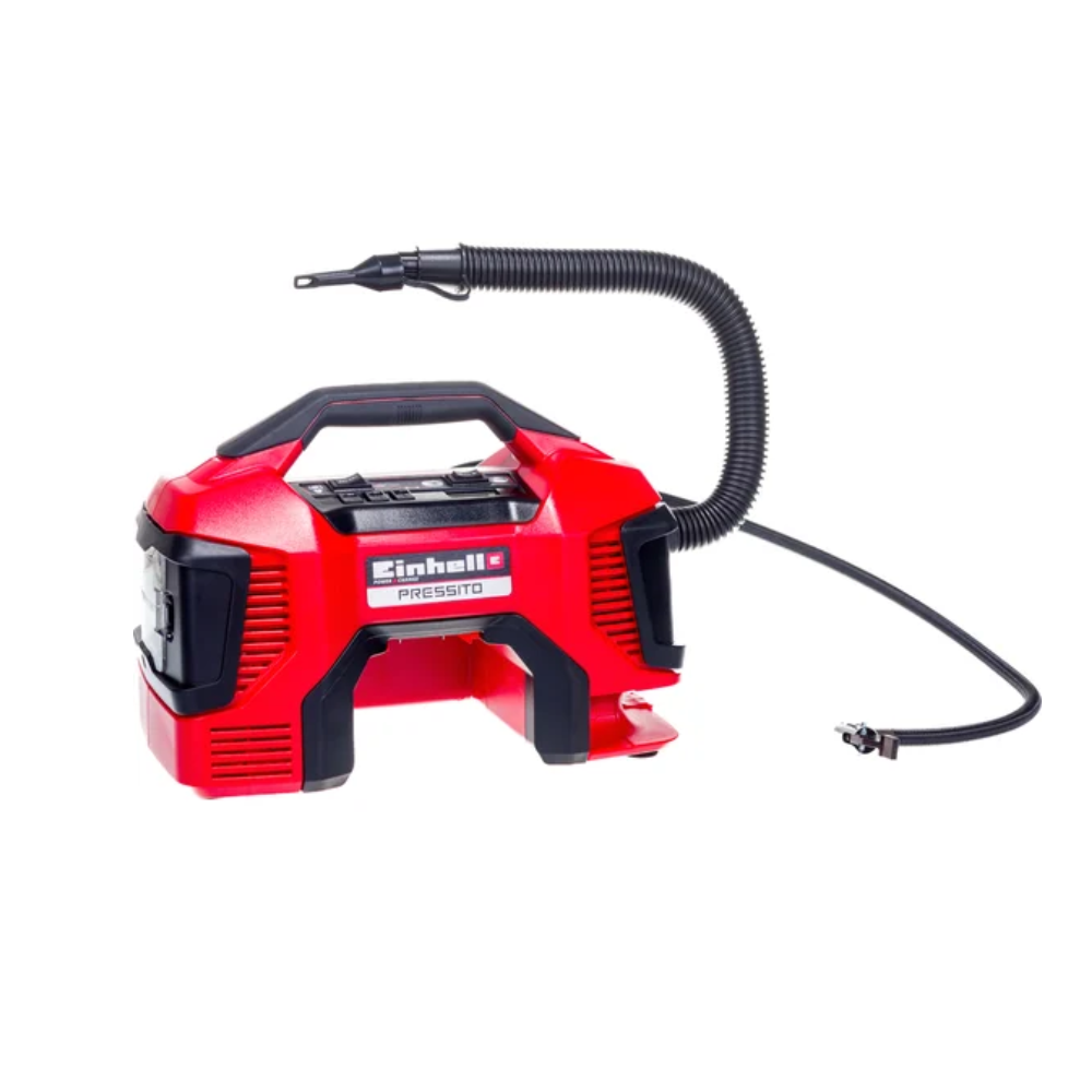 Автомобильный аккумуляторный компрессор Einhell PXC PRESSITO 4020460 может работать как от сети 220В, так и от батареи 18В семейства Power X-Change. Данное устройство оснащено насосом низкого давления для надувания и сдувания лодок и матрасов, а также насосом высокого давления для подкачки мячей и шин.