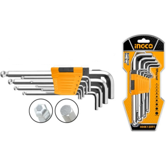 Набор шестигранных ключей с шаром INGCO HHK12091 INDUSTRIAL включает в себя 9 ключей различного размера, которые служат для монтажа и демонтажа крепежа с внутренним шестигранным шлицем. Инструмент изготовлен из прочной хромованадиевой стали. Каждый шестигранный ключ заканчивается шаром, который позволяет работать в труднодоступных местах. Данная информация скопирована со страницы: https://ingcorussia.ru/ruchnye-instrumenty/nabory-instrumentov/nabor-shestigrannyh-kljuchej-s-sharom-industrial-ingco-hhk12091