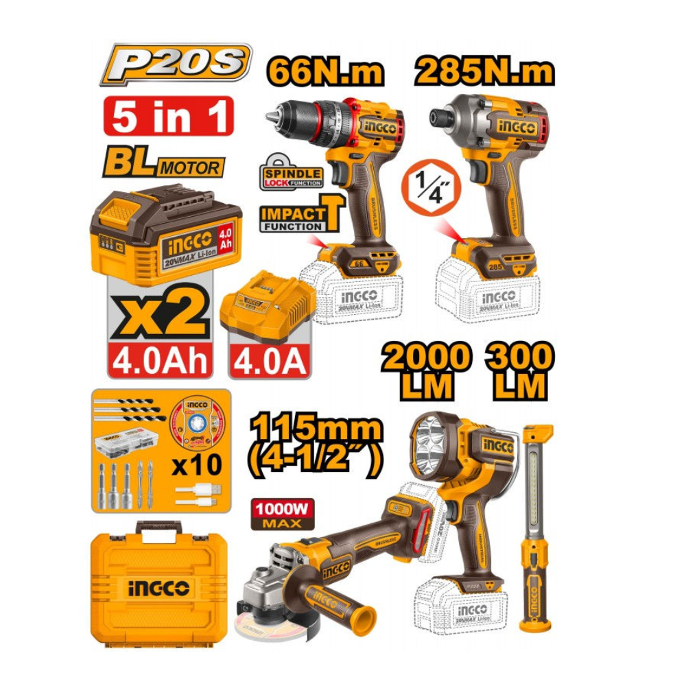 - Поставляется в кейсе Ударная дрель-шуруповерт без щеток 66 Нм, 2 скорости, LED , Ударный гайковерт без щеток 285 Нм, 3 скорости, LED , Угловая шлифмашина без щеток 115 мм, 1000Вт, 3 скорости , Аккумуляторная рабочая лампа 2000 лм, 3 режима, поворот головы 130° , Переносная лампа 300 лм, Li-Polymer, крючок + магнитное основание